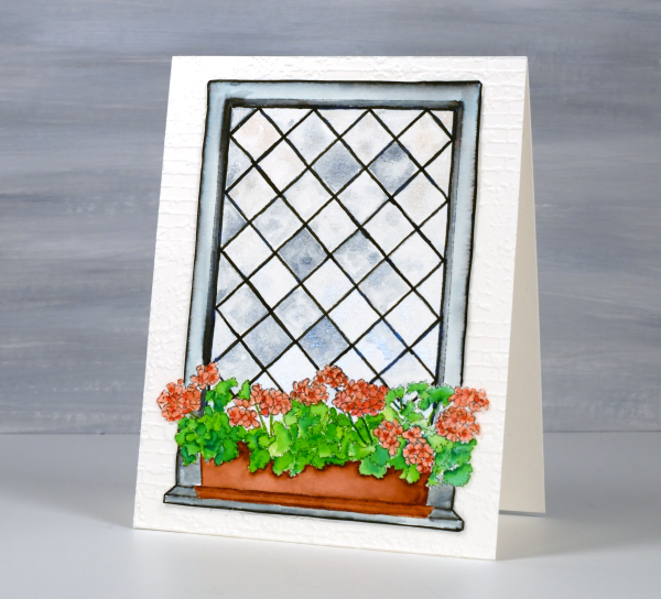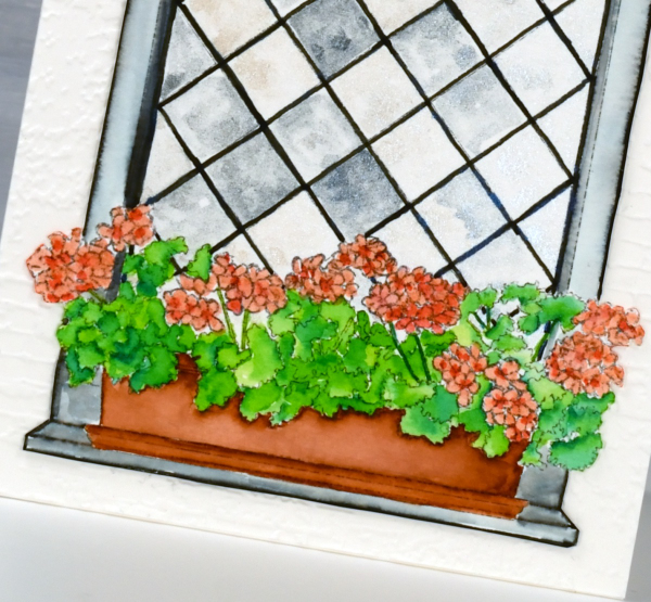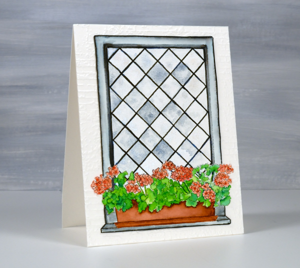 Don’t you just want a window like this? With blooming flowers not wilting in the heat! This digital stamp is called ‘Window Box’ and it is new from Echidna Studios. My daughter designed it and there are three files to play with in the set, the image you see here as well as a separate window image and a separate window box image. I’m looking forward to trying the window box image by itself enlarged to fill a card front.