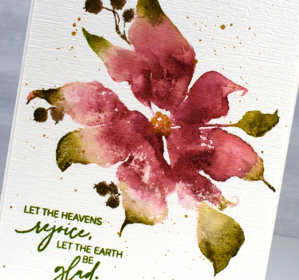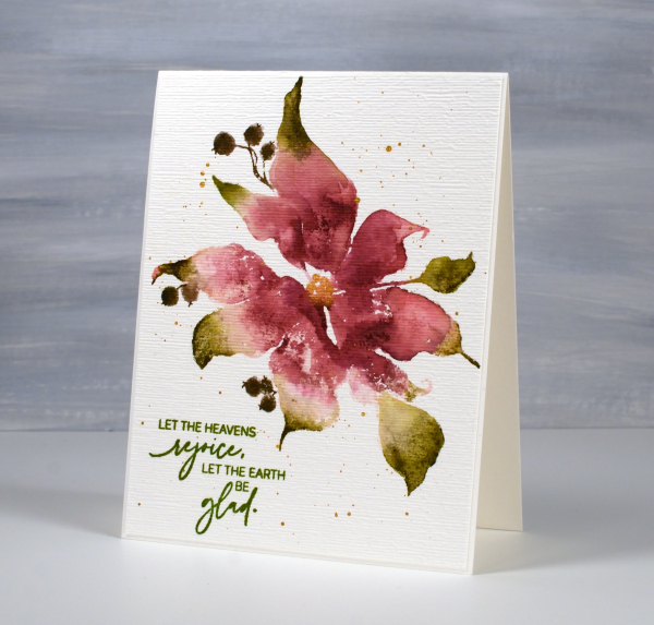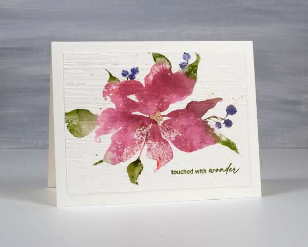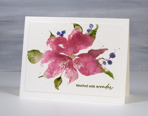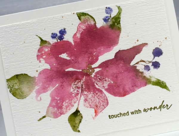 I inked most of the petals with a pink ink then added darker ink with more of a burgandy such as aged mahogany. I use a mix of small cube ink pads and markers to ink the stamp. The leaves were inked with peeled paint and the berries a purply blue such as chipped sapphire. Before stamping I spritz the stamp so the inks can move a little. I stamp the first impression then decide whether more ink is needed, more water or often some blending with a paintbrush and water.