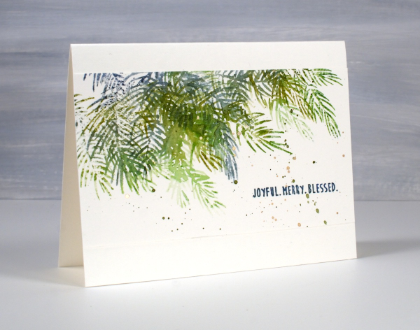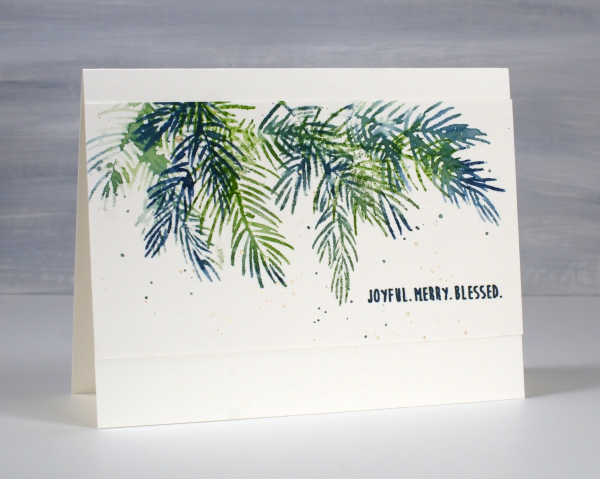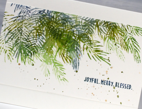 Using the two of the three Penny Black ‘delicate pines‘ stamps positioned to stamp along the top edge of the panel I inked them with a few green and blue distress inks. Before stamping I spritzed the stamp lightly so the different greens would blend on the stamp and then on the paper. I then moved the stamps around so I could use the third stamp and get some overlapping branches. Without moving the stamps I turned the watercolour panel 180° and repeated the stamping steps. The panel ended up with a border of pine branches on each side. I cut the panel in half and trimmed the sides so I had two 5½” x 3″ panels to add to card bases.