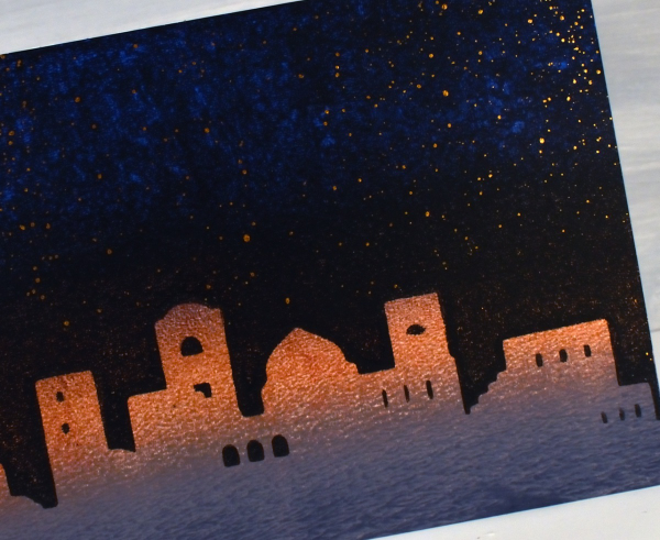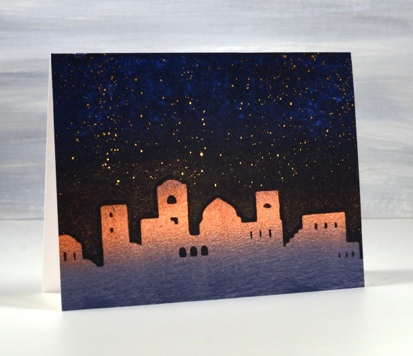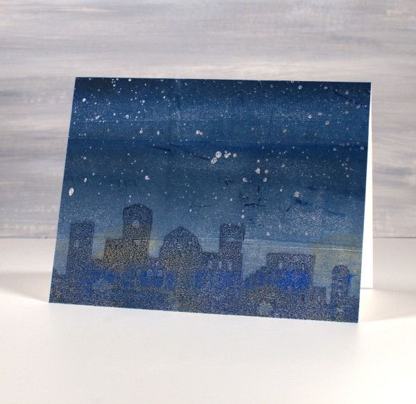 The panel below is less distinct as I pressed the mask into a layer of Paynes grey paint on the gel plate, removed all paint around the mask then lifted it to reveal a shadowy Bethlehem. Once it was dry I brayered blue and gold paints over the top before pulling the print. Once again I added metallic paint splatter to sky, this time lunar silver.