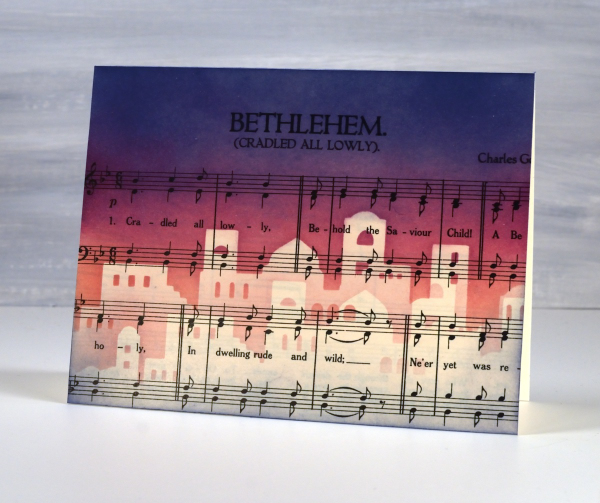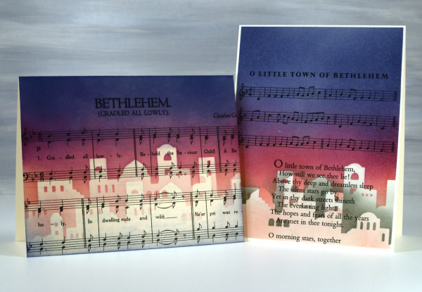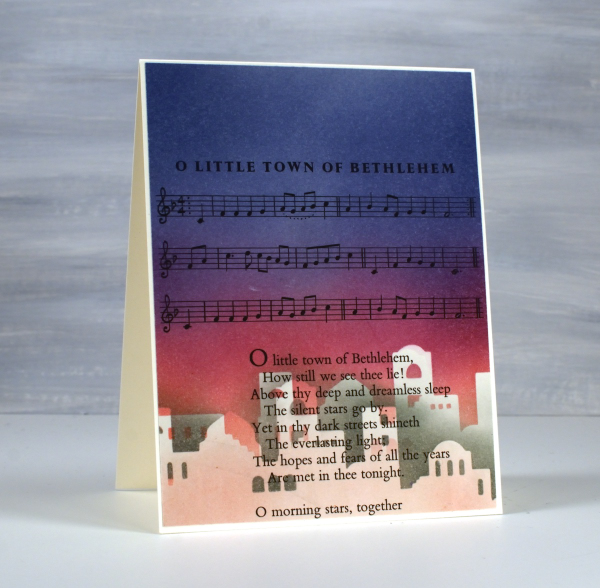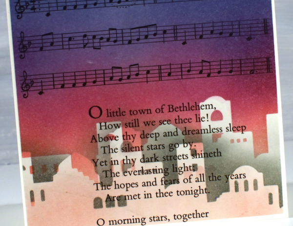 In a similar style to the carol and stencil cards I shared last week I used the Bethlehem mask cut from Matte Dura-lar to blend a scene on two carol panels cut from vintage carol books.