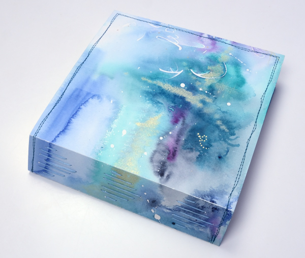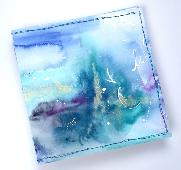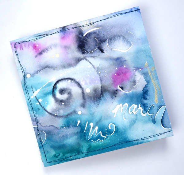This cover was inspired by Tiffany Sharpe’s lovely stitched and watercoloured cover. I made my book 7″x7″ which was different to the rectangular examples in the workshop but all the steps are the same once you work out your dimensions. I have now made three 7×7 watercolour journals and like the page size for art journalling.