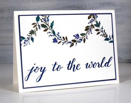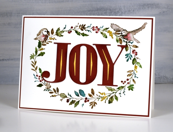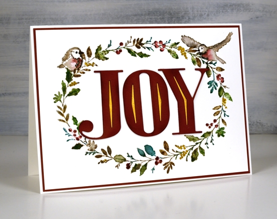 I used distress inks and markers to ink the wreath elements and birds, keeping the stamp in the positioner so I could work a bit at a time. I inked the stamp, stamped the image then did a bit of blending with a paintbrush to fill the leaves, berries and birds.