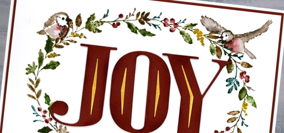I used a gold gel pen to colour some of the berries then continued the gold highlights in the die cut word. The die has decorative diamond cut outs so I cut gold ones to add to the burgandy letters and framed the panel in the same burgandy cardstock.