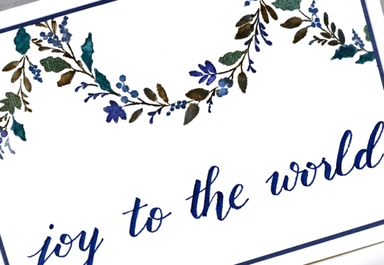For the second card I decided to use the curve of the wreath as a hanging garland. Using a centering ruler to help me with positioning I stamped half the wreath on the centre top edge of the watercolour panel, then stamped another part loop either side.