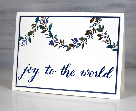 I used a piece of dark blue cardstock for a card base then stamped the ‘bell & berries’ on both an insert panel and the envelope.