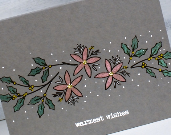 I painted the leaves in moss green pearlescent paint from the Coliro ocean set and the flowers with rose from the vintage set then switched to gel pens to fill the berries with gold and dot white around the designs.