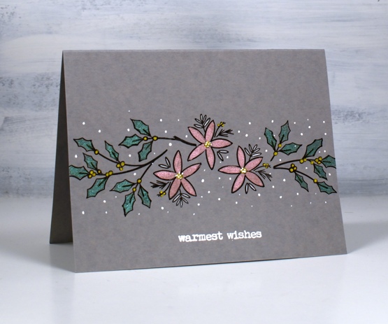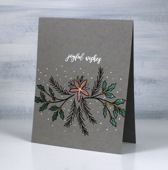 I used the textured grey luxe cardstock from the Foiled Fox and combined outline stamps from the Penny Black set {heart Christmas} to make a design with versafine clair nocturne ink.