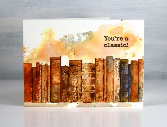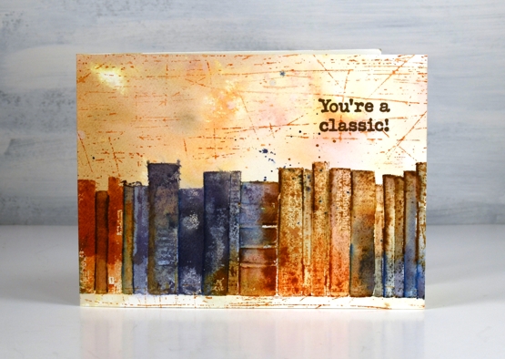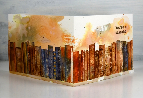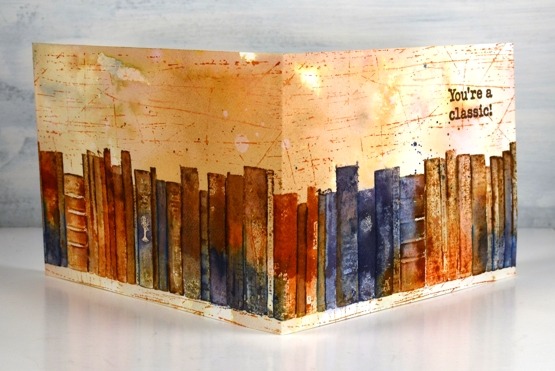 The fun thing about the Darkroom Door ‘bookshelf’ stamp is its length (just under 12″) so I decided to wrap it around my cards for maximum effect. I worked on two cards at the same time giving them slightly different paint jobs and background finishing touches. Watch the video to see my process.