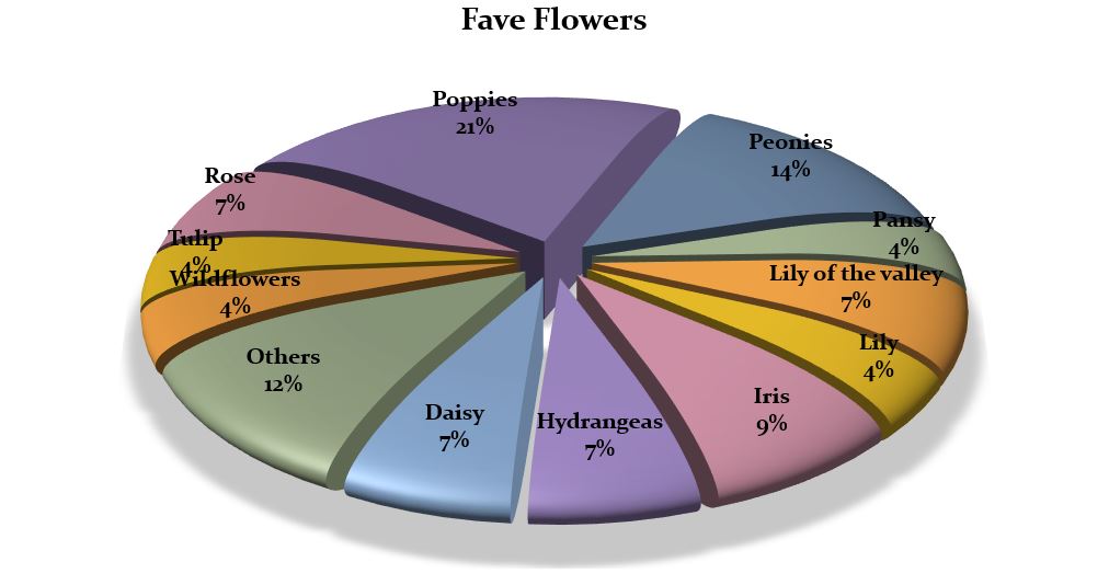 Thank you to everyone who participated. I loved reading about your favourite flowers; some of them were new to me so I had to look them up! I made a chart to show you what the top faves were; I couldn’t give everyone’s choice a piece of the pie as the labels became impossible to read! I enjoyed reading why they were faves too, many of you associated a flower with a memory, a person, a colour or a fragrance.