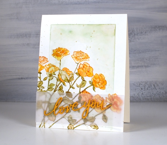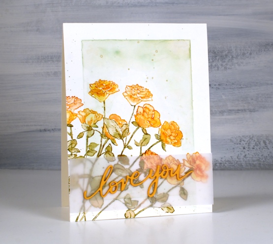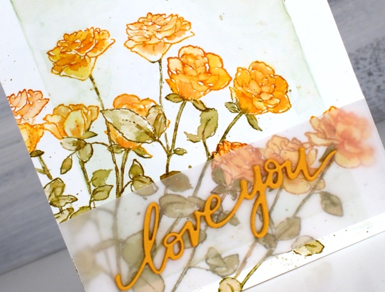 You might recognise the background style on this card; it is inspired by some of Jill Foster’s amazing cards for Penny Black. Because all those roses make the panel a little busy I separated the stacked die-cut words from the roses with a piece of vellum, just to make it easier to read. Don’t forget to visit the Foiled Fox blog today for all the details and while you are there browse awhile for more inspiration.