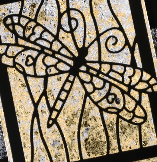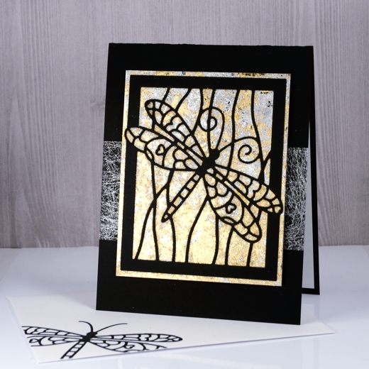 My initial experiments have resulted in six cards which I will share over the next little while. I played with a few techniques for adhering the gilding flakes and today’s is possibly the most effective so far. A word of warning, the gilding flakes are lighter than feathers and they do go everywhere! Jennifer McGuire suggested a swiffer cloth for clean up so I might just need to get one of those! To create the gilded background I cut a piece of ‘stick-it’ adhesive sheet larger than my dragonfly frame die and stuck it to a piece of white cardstock then removed the backing paper. Next I cut the dragonfly frame from black cardstock and positioned it on top of the adhesive rectangle on the white cardstock. I gently laid both silver and gold gilding flakes onto the adhesive panel and pressed lightly. The gilding adheres effortlessly to the ‘stick’it’, filling the entire area not covered by the black die cut. I burnished the flakes gently with a scrubby which breaks off excess pieces and makes sure all the adhesive is covered. The scrubby tends to turn the shiny silver and gold to brushed silver and gold so if you want maximum shine then burnish with your fingers or something smoother than a scrubby.