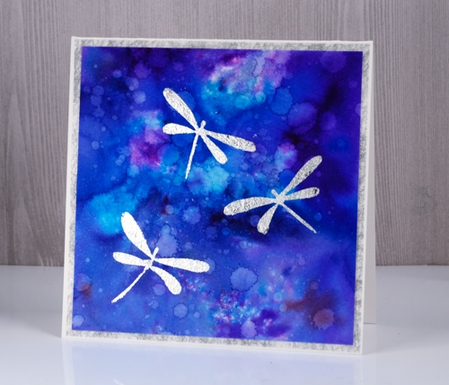 Posted: May 26, 2017 Filed under: Flutters, Gilding Flakes | Tags: color burst, Fabriano Watercolour Paper, Gilding, Penny Black creative dies 9 CommentsMy second gilded card also features dragonflies, this time little silver ones. In my previous post I shared a card gilded in both gold and silver flakes; this time I just used silver because I think silver and blue look so very pretty together. I used stick it adhesive once again to attach the gilding to the watercolour panel and colorburst powders to create the background panel.