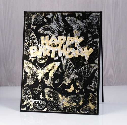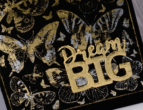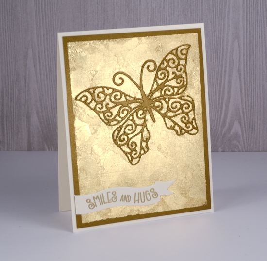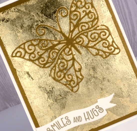 I had fun gilding the sentiments too. I cut both from adhesive backed foam and pressed the gilding flakes directly onto the adhesive side then smoothed them all over and into the nooks and crannies. I then stuck the gilded die cut sentiments onto my butterfly panels.