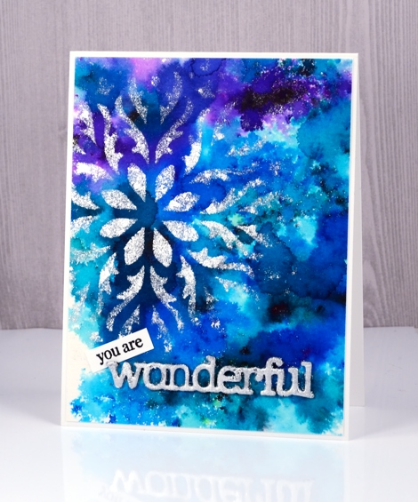 The gilded panel below was very pretty alone so I didn’t want to add much to it. The alcohol ink panel was also pretty but worked well with die-cut silver snowflakes.