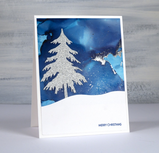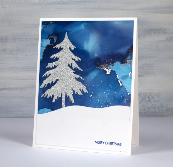 I have another alcohol ink sky to show you today paired with a very sparkly tree. I don’t own the tree die or the sparkly silver paper but this tree was a leftover from a class I attended and it looks so pretty against the blue sky. It is hard to capture on camera but there are lines and dots of silver foil on the alcohol ink background.
