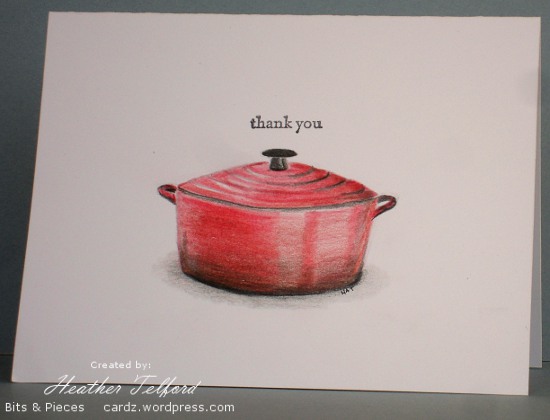Posted: January 5, 2011 Filed under: Coloured pencil, Hand drawn 4 CommentsI have something a little different to show you today. I was going to say “no stamping involved” but I did stamp that wee “thank you” above the pot. You only need to browse through my blog a little while to see that I don’t have many stamps that are not organic images of some kind. Other than a few “boy” stamps they are all decorative elements or plants! When I wanted a thank you card for a very generous friend who gave us a chili mix for Christmas I decided to draw my own image. I was also motivated by the desire to use my Christmas present.