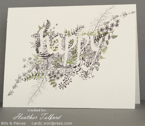 I posted some similar cards recently where I painted a word with masking fluid and doodled all around the masking. To create this card I did the same with the masking fluid but drew all the flowers and foliage with watercolour pencils and fine liner and then added a little sponging at the end.
