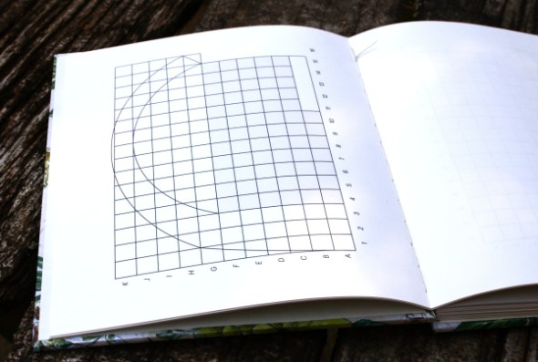 The size is 6″ x 4.75″ and some of the pages have tabs on them to divide up the book. The binding allows the book to sit flat when open which is nice. I am using it to practice drawing simple line drawings in black and white.