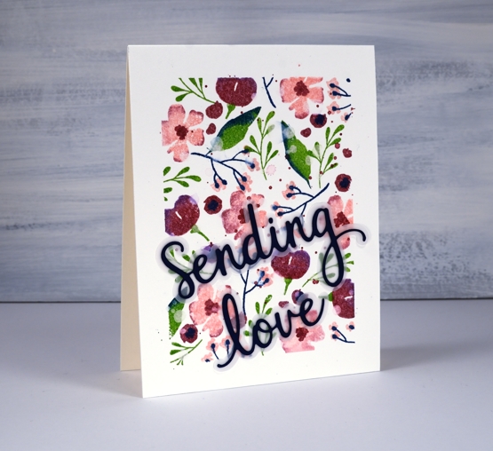 I removed the tape to reveal lovely straight edges and wanted to add a sentiment that didn’t cover too much of the pattern. The background was too busy for just the die cut words but adding the shadow for each word cut from vellum created enough separation to make the words ‘sending love’ readable. The dies are from Pink Fresh Studio and the set is called ‘Phrase Builder – Sending’; unfortunately it isn’t linked below because I could not find it available anywhere. I bought it a few months back for a class that was originally scheduled for March…