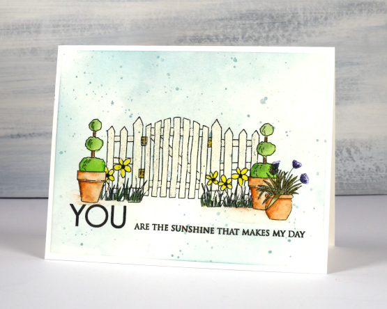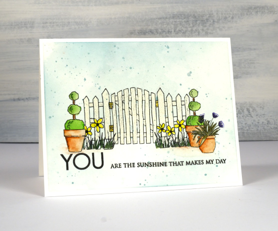 This little front fence is a new digital stamp from Echidna Studios. It’s a set of five images that you can arrange yourself. Each image is opaque (or stackable) which means when you arrange them before printing you can put the plants in front of the fence and in front of each other. The five stamps are the fence, the triple topiary, the flowers in the grass, the flowers in the pot and another pot not featured on this card.