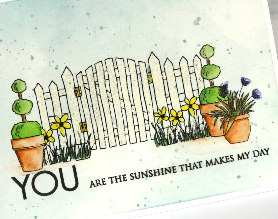 After colouring the pots and the plants I had to decide how to colour the fence and gate because it wasn’t going to stand out if I left it white. The problem was that I wanted a white picket fence. I ended up colouring the fence and gate with an embossing pen then embossed with Ranger weathered white embossing powder which is textured and creamy coloured. It’s subtle but it does make the fence stand out a little. I coloured the hinges with a gold gel pen.