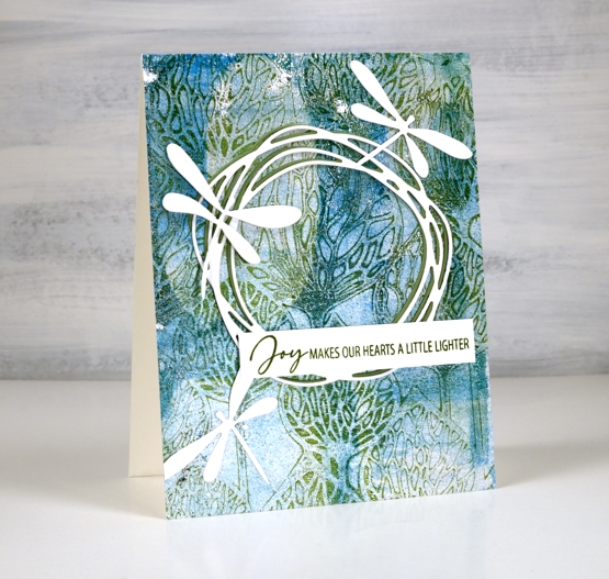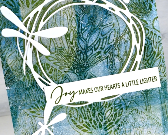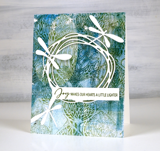 Over the print I added a green and a white wreath die cut from Penny Black. It is part of the new ‘soaring’ set which also includes four butterflies. The background called for dragonflies rather than butterflies so I die cut three from the ‘flutters’ set, an oldy but a goodie.