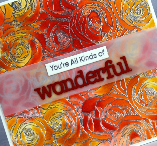 Next I liberally spritzed the panel so the inks would dilute, blend and fill the petals. This technique is one a friend of mine affectionately calls ‘drowning’. The ink mixed pretty well by itself but I did use a paintbrush here and there to make sure the whole panel was coloured. I dried it, trimmed it and added a band of vellum so my sentiment strip and die-cut would not have to fight with the busy background.