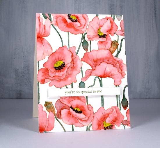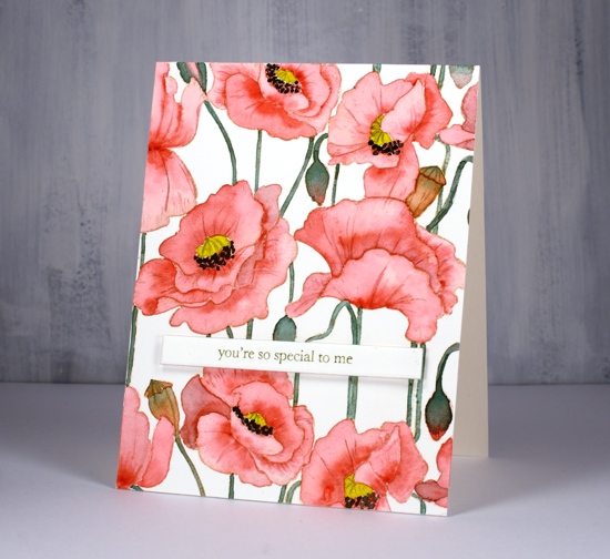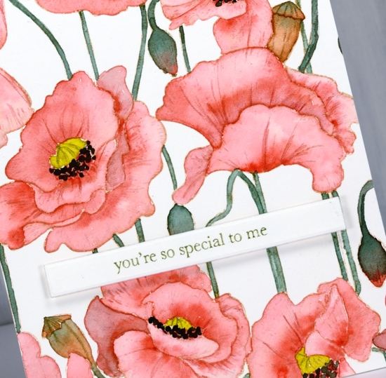 When I pulled out the MFT ‘poppies background’ stamp my intention was to do some loose watercolour with splashes and dabs here and there. As you can see I didn’t manage that; I stayed inside the lines. It was not a fiddly job though, painting this panel. I was surprised at how quickly I was able to get it done. I put the stamp in the stamp positioner along with a piece of cold pressed watercolour paper. Using the papertrey ink cubes I was able to ink the flowers in ‘scarlet jewel’ and the buds, stems and pods in ‘ripe avocado’. If the inks ended up on the wrong section I either wiped it off or let it be because a little green in the flowers or red in the stems doesn’t matter.
