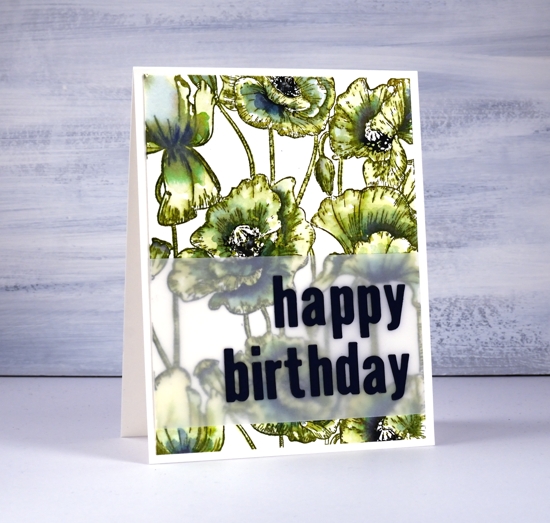 The second panel definitely involved more slap dash watercolouring but I still managed to stay inside the lines. I stamped the whole image in distress peeled paint which blends very easily with water. As I wanted some depth of colour in the centres of the flowers I smooshed faded jeans and chipped sapphire distress inks on my glass mat and picked up ink to paint shadows on the petals. I inked up the centres of the poppies with a chipped sapphire marker then chose a dark blue (not black) cardstock to die-cut the letters for the sentiment.