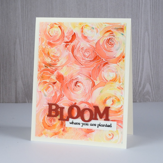 Next I liberally spritzed the panel so the inks would dilute, blend and fill the petals. This technique is one a friend of mine affectionately calls ‘drowning’. The ink mixed pretty well by itself but I did use a paintbrush here and there to make sure the whole panel was coloured. I dried it, trimmed it and added a band of vellum so my sentiment strip and die-cut would not have to fight with the busy background.