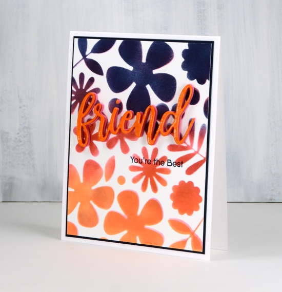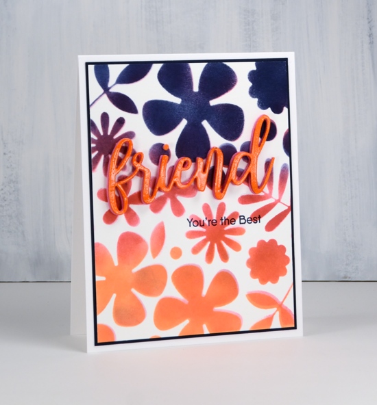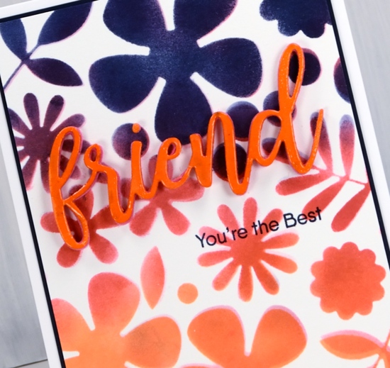 With such bold colours and shapes in the background I needed to make my sentiment stand out. I cut the word friend from orange cardstock, embossed it in clear and added it to two stacked pink foam die-cuts. I added part of a sentiment below in juniper mist ink. To tie that in I matted the whole panel in dark blue and added it to a white card base.