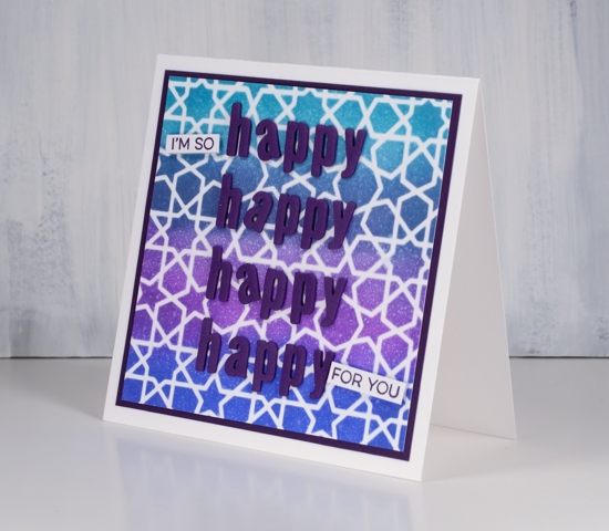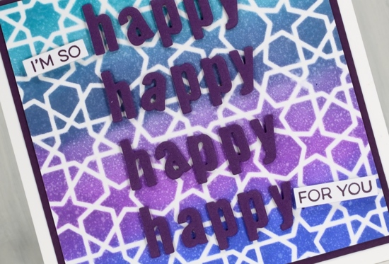 I matted with purple cardstock and die-cut 4x h, a, p, p, y using the ‘little lower case letters also from MFT. I stamped some words from the MFT Yay for you set to complete my enthusiastic sentiment.