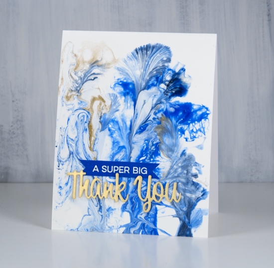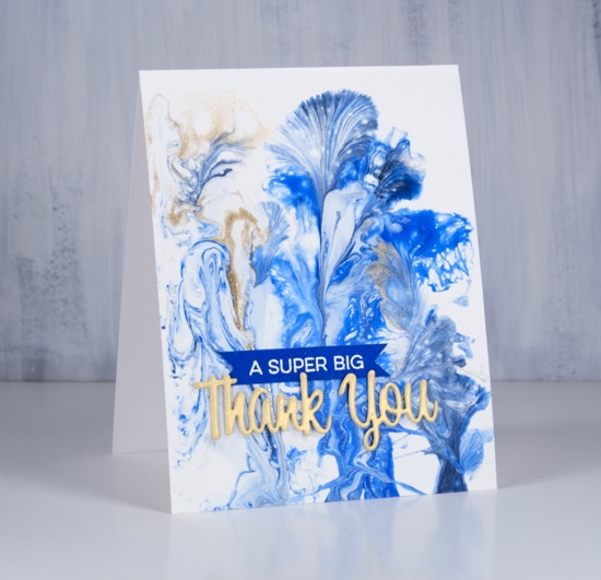 I did several pours on heavy yupo and a couple of little canvases. They take a while to dry so I have turned only one into a card so far. I won’t go into detail about the technique or supplies; I’m too much of a newbie. If you want to learn about paint pouring then look up Myriam’s Nature on youtube and prepare to give up the rest of your day being mesmerized by her beautiful panels. My base for this design was white paint then I dipped threads into blue paint and gold paint and dragged them across the panel to create these pretty patterns.