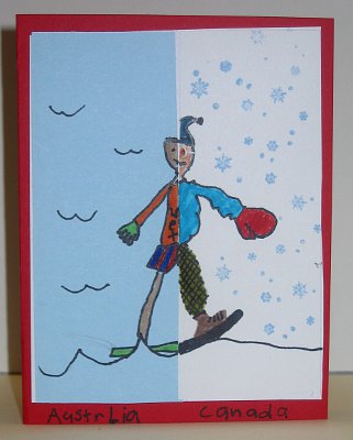But my personal favourite is the hand drawn farewell card he made for his 19 year old cousin who stayed with us for a few weeks. He skated; he skied; he made snowmen; he tobogganed and then within a few days of leaving us he was on the coast of Australia, surfing.