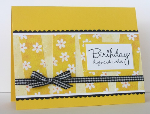 Posted: July 17, 2010 Filed under: Designer Paper, My Kid's cards 1 CommentOn Tuesday we celebrated my 14year old daughter’s birthday. This is the card I made for her which coincidentally matched the FIFA replica soccer ball her brother gave her. I used two pieces of patterned paper in the centre panel, adhering the flowered strips onto a pale yellow/white piece and then trimming them. I matted in white, then black which I had cut with scallop scissors. I love the look of the gingham ribbon it’s very bold and happy.