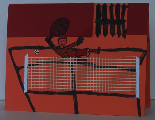 My son continued the sport theme he used when making my younger daughter’s soccer card, changing the sport to tennis and using some self adhering mesh I had for the net. We all think he should make a whole range of sports action cards. Thanks for dropping by to see the diversity in card making styles at our place!
