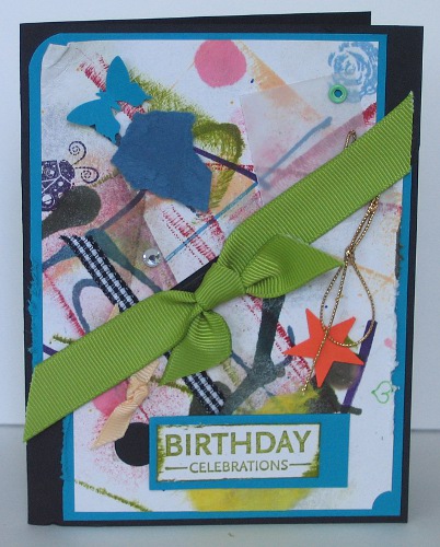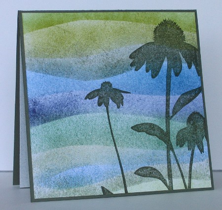 Posted: August 7, 2010 Filed under: Inspired by Nature, My Kid's cards 2 CommentsI mentioned the other day that I would post the handmade cards my 16 year old received for her birthday, so here they are. The one above is the one I made. The background is all sponged; I made a wavy mask, sponged the top colour then cut a different wavy pattern across the top of the masking paper, sponged again, new mask, more sponging and so on. I didn’t worry about sponging over the colour I had just done as it did make too much difference. When all my stripes were complete I stamped the image from Inspired by Nature in Artichoke and added a paper insert to write on.