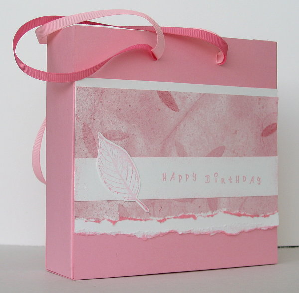 Posted: August 19, 2008 Filed under: My Kid's cards, Purses 2 CommentsThis sweet little gift bag was made by my daughter L14. As she is on holiday and the music theory exam, which took up the last month is over, she has spent a bit of time creating things at my craft desk. The front is 5¼” square and the side 1½” wide. The designer paper was in my stash from several years ago and matches beautifully with Pretty in Pink. Two lengths of ribbon are threaded through holes at the top of the bag and knotted on the inside to make handles.