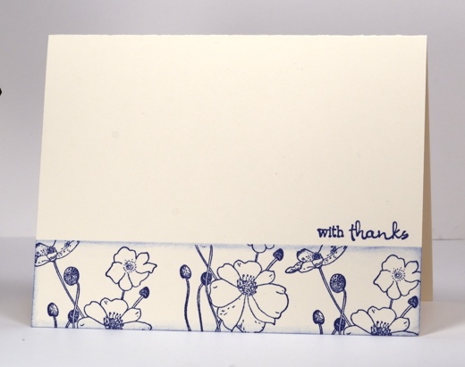 Posted: May 15, 2013 Filed under: CAS, Love is in the Air, OLW, Penny Black 16 CommentsThis week’s One Layer Wednesday challenge is all about making or stamping a border on your one layer card. You can use stamps designed for creating a border or you can create a border with any stamps as I did for these two cards. I masked both cards with a post-it note and then stamped and sponged below the mask so the stamping became a border pattern. On the card above I embossed a few flowers in white first, stamped some more in red then sponged over all the flowers with yellow, orange and red. On the card below I just stamped the delicate poppy stamp three times and sponged a tiny bit to define the edge of the border. For this challenge I want the border to be the main event on the card. Border and sentiment that’s it, no more!