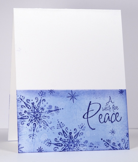 I masked the top of the card front so I could brayer a blue base of Memento summer sky ink. I then stamped some snowflakes in the same summer sky ink; the effect is so subtle you probably can’t see it! Before stamping the snowflakes again in Memento Paris Dusk I spritzed them with water resulting in some of the smudgy images. I then added the small snowflakes and sentiments and strategically placed some water droplets to look like they fell there by chance. I sponged the edges with Paris Dusk before removing the mask.