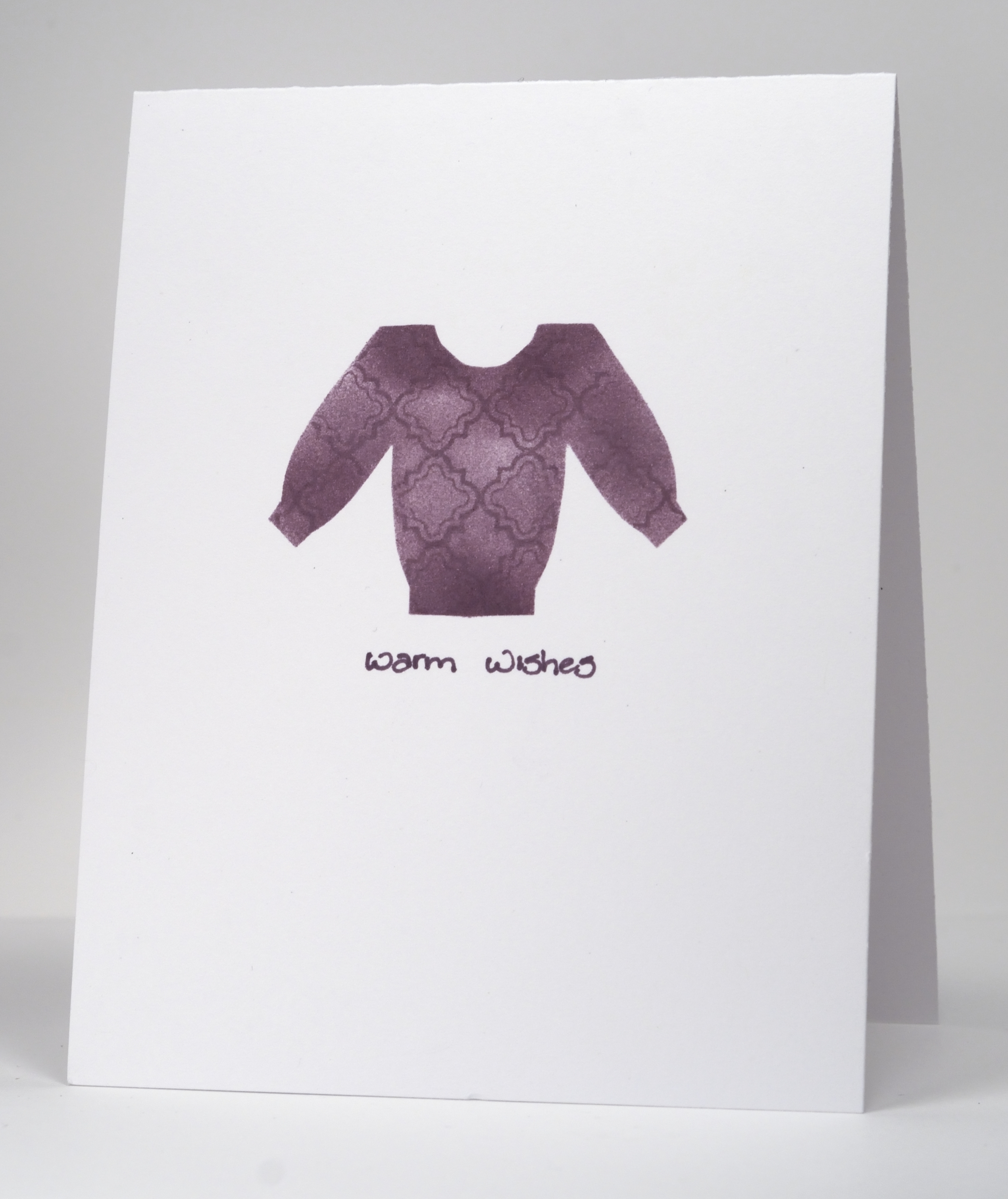 I decided not to go for a warm colour scheme as my previous two cards were all about colour schemes so I looked for a warm image and didn’t find one. Nonetheless I persevered and created a little sweater mask and sponged myself a sweater, adding a border stamp to give it a little pattern and texture. Wouldn’t you know it, I did not have a stamp that said ‘warm wishes’ so I wrote it myself.