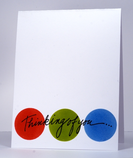I chose the funky travel mug below because those dots were just crying out to be made into a card. I punched a circle in a post-it note to make my mask and sponged Memento Lady Bug, Pear Tart and Summer Sky before completing the card with the Penny Black sentiment Thinking of You.