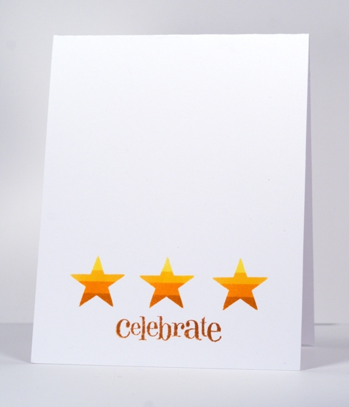 I realized after I had finished that this almost exactly the layout I used for my last OLW card; sorry for the lack of variety. This simple three star card took three attempts to complete as I smudged yellow ink outside the star on the first two cards. Sigh. Other than that little hitch it was a very straightforward card. I punched the stars out of a post it note to make the mask. I then sponged yellow first, added a straight mask, sponged orange, repositioned the mask and so on.