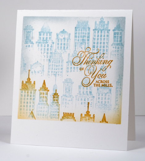 I have created city-scapes with this stamp before using more of a watercolour effect. I simplified the process for this one layer version. I masked a square with painter’s tape and inked the top of the stamp with tumbled glass distress stain. I stamped once, reinked the top of the stamp again and stamped below the first impression. I stamped a third time with blue then added a little memento potter’s clay ink for the last two impressions. I sponged the perimeter in blue and potter’s clay before removing the masks and adding a sentiment.
