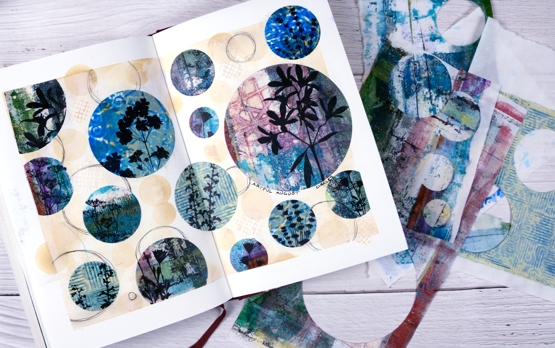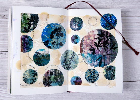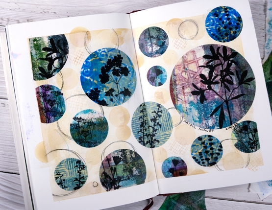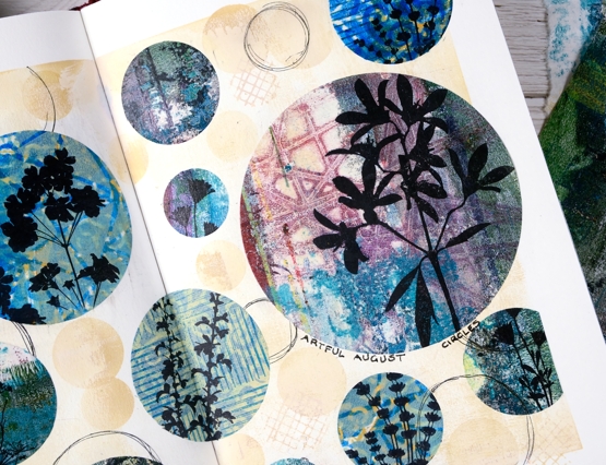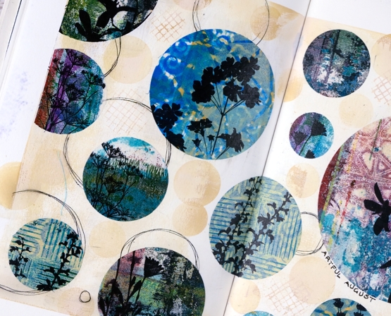 Rachel Greig from Darkroom Door is hosting ‘Artful August’, a challenge to make something arty each day in August. She has provided 31 prompts and I am going to play along as often as I can. Circles was the prompt yesterday so I cut circles from a just few of the many gel print panels I have piling up. I used only gelprints done on rice paper and they cut and adhered very easily.