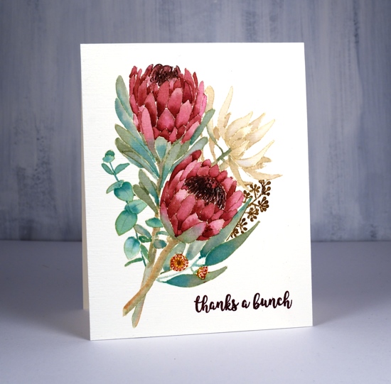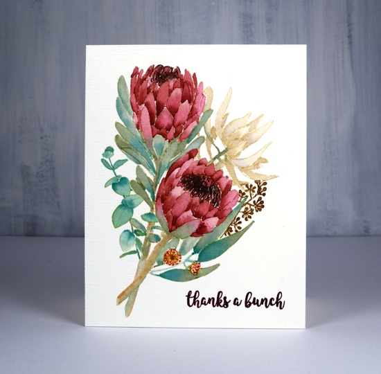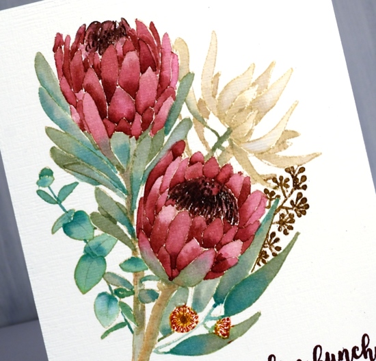 Posted: September 9, 2019 Filed under: Paper Rose, thanks a bunch | Tags: Paper Rose 15 CommentsSome of you will be familiar with the flower featured on this card. It’s the Australian waratah, state flower of New South Wales. When I was in NSW recently I visited ‘Alice in Paperland‘ in Port Macquarie and picked up this beauty. Due to my recent class I’m still on a no-line watercolour kick so that’s the method I chose for the stamp’s first inking. The set is called ‘Thanks a bunch’ and includes this large stamp, the sentiment I used and some little ones. I stamped in antique linen distress ink, kept the stamp and hot pressed watercolour panel in my stamp positioner then searched the interwebs for photos of waratahs. Even though I found plenty of bold red ones I chose a slightly more muted colour scheme and painted it with diluted aged mahogany ink. As usual I smooshed the aged mahogany ink pad on my glass mat so I could dilute the ink easily and pick it up with a paint brush. I worked petal by petal which took a while but I mixed up the process by switching to leaves while petals dried and also taking snack breaks.