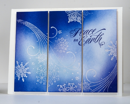 Posted: September 12, 2012 Filed under: A Bright Tomorrow, Penny Black 14 CommentsToday the Penny Black blog is featuring cards using the new transparent set “A Bright Tomorrow”. It is a set of very pretty snowflakes, Christmas balls and a little wreath. I used the emboss resist method to create my swirling snow scene. All the images were stamped and embossed in clear before I sponged over the whole panel with a mix of blue and lilac Memento inks. I cut the panel in three then popped it up on the card base.
