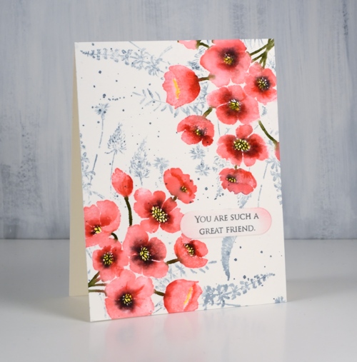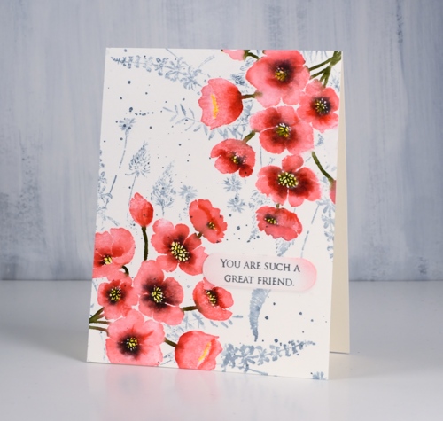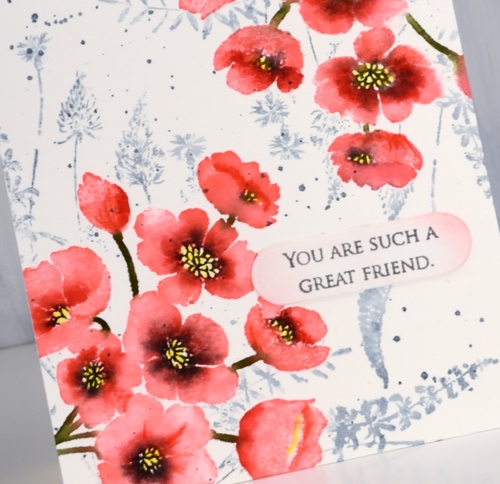 To add a background I had to mask the flowers so I stamped them on masking paper, cut them out and covered my completed corners while I stamped ‘a floral twist‘ stamp in weathered wood distress ink and added a few splatters too. All that was left was to add a sentiment; I decided on something small from ‘grateful sentiments’ on a little die cut label with the edges sponged in worn lipstick ink.