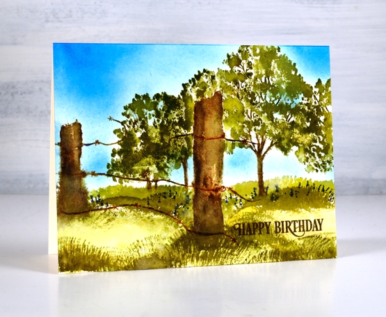 As the fence posts are in the foreground I stamped them first in a mix of browns, black and grey then blended on paper with water. Once the posts were dry I inked the trees in a few greens and brown avoiding the area behind the fence post. I should have masked the posts but I was feeling a bit lazy so I just inked and stamped several times getting closer each time to the post without stamping over it.